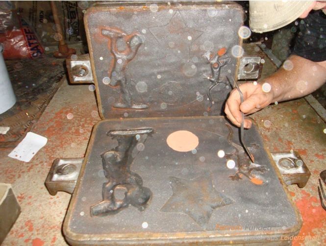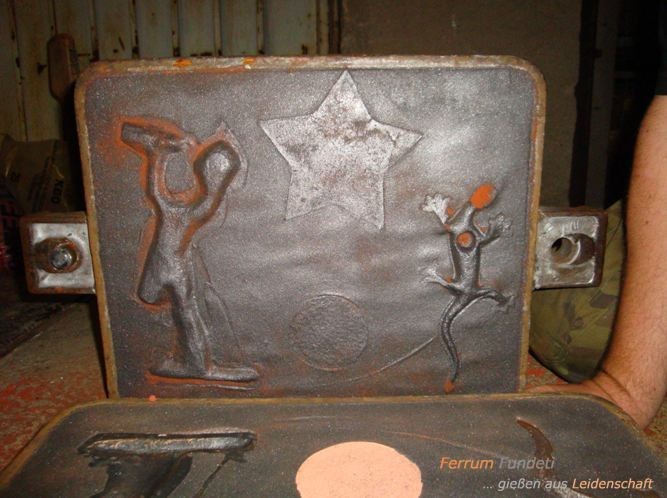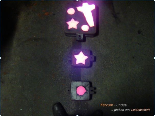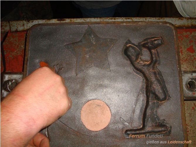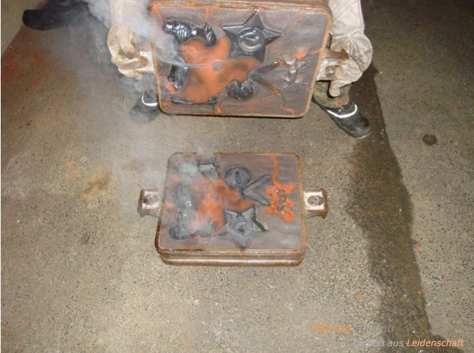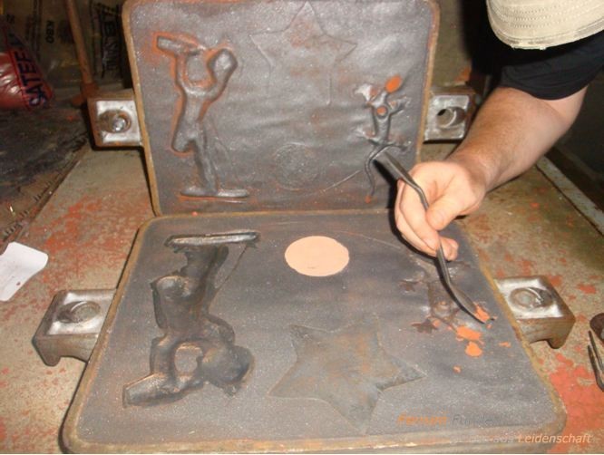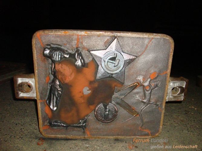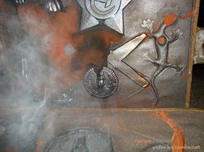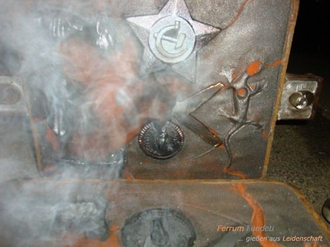 Es wurden verschiedene Objekte in Bronze gegossen, darunter Medaillien und ein Kreuz.